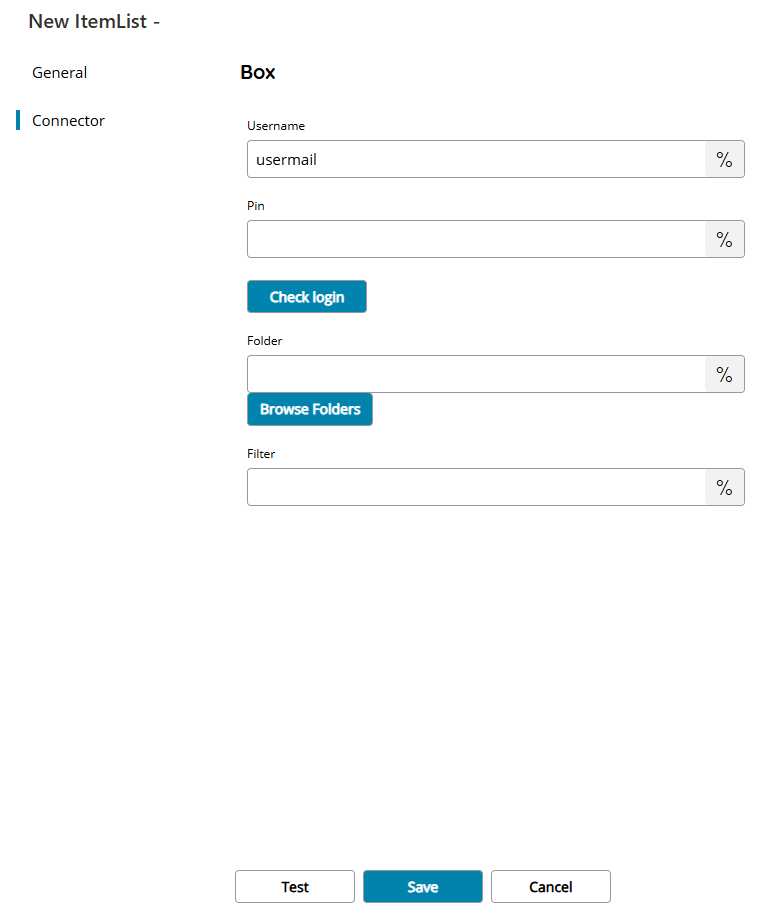 Enter the main folder where to browse from in Box, select a folder by pressing the browse folders button or click on the Variables button on the right, to select a variable which will contain the parent folder.