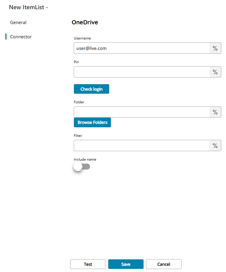 Enter the main folder to browse in OneDrive, select a folder by pressing the browse folders button or click on the Variables button on the right, to select a variable which will contain the folder.